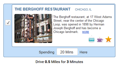 View all the destinations between your Starting and Stopping points. Destinations include a brief description, photos, and icons representing services offered at that location. If you choose to stop, choose how long you plan to visit. We will update your total travel time with the time spent at each destination.