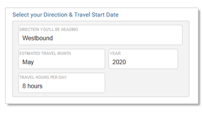 Select whether you plan to travel Westbound or Eastbound. Next, enter your estimated travel month and year so that we adjust the estimated travel times and attractions based on seasonal activity. Finally, estimate how much driving you would like to do per day.