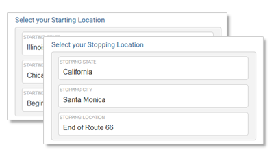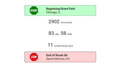 You can select any of the Route 66 Locations to use as your Starting Point and your Stopping Point. This way you can choose to travel the whole route, or any part of it. The mileage and timing estimates are all based on your selected points.