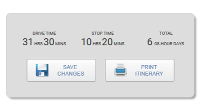 With each change to your Itinerary, you will see your Drive Time, Stop Time and Total Trip-Days update on the bottom of the screen. You can Save your changes as you go along, Re-Open and modify your Itinerary, and Print your Itinerary at any time during your trip planning.